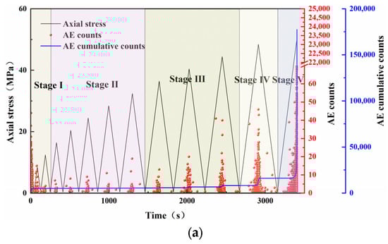 Peak stage: There are substantial increases in AE ring counts and AE energy, reaching the highest point, while the cumulative AE ring counts and cumulative AE energy surge to their maximum in an instant. This stage is characterized by the most intense acoustic emission activity and the strongest signal strength, indicating that the sandstone is about to fail. Research has found that under low stress conditions, no AE signals are generated during the unloading stage, while under high stress conditions, AE signals are produced during the unloading stage.