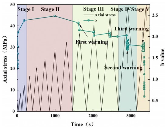 Many scholars have adopted the b-value of acoustic emission (AE) to study the precursors of rock failure, believing that researching the b-value can help to profoundly understand the mechanisms of rock failure and has significant practical importance for the prevention of instability and failure in rock engineering [47,48]. It is calculated as follows: