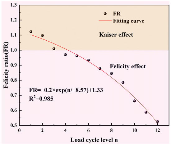 Figure 12 shows that the value decreases with the increase in load cycle level, and the rate of decrease accelerates over time. The Kaiser effect occurs when the , implying that the sandstone is in a stable state with no severe internal damage. When the , the Felicity effect appears, and the sandstone gradually moves toward an unstable state as the stress increases. The experiment found that when the FR value is less than 0.7, macroscopic cracks appear on the surface of the sandstone, and these cracks rapidly extend as the value decreases. Consequently, the Felicity ratio can be used as a predictive tool for the precursors of rock failure.