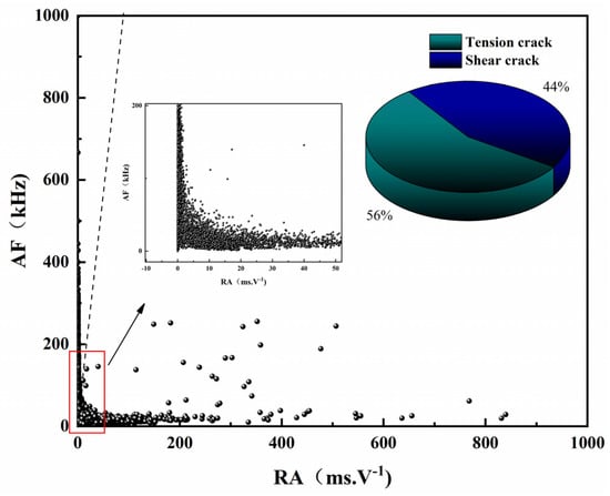 as important parameters of acoustic emission, are often used to describe the crack pattern classification, and the cut line directly affects the division of the crack category. According to the relevant research, the cut line is taken as . They are given by: