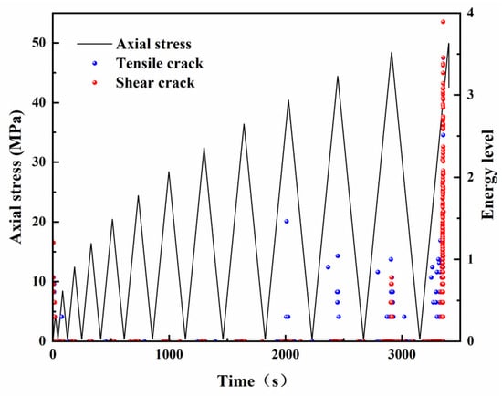 Figure 14 illustrates the changes in energy levels of shear and tensile cracks during the failure process of sandstone. From the figure, it can be observed that during the compaction stage of pre-existing microcracks, the energy level of shear cracks shows a certain upward trend, while the energy level of tensile cracks has almost no signal, indicating that shear cracks dominate during the compaction stage. As the material enters the linear elastic stage, there are no signals for either tensile or shear crack energy levels, suggesting no damage occurs in this phase. When entering the stable crack propagation stage, the energy level of tensile cracks begins to show signals, with some points reaching an energy level of 1.5, while the energy level of shear cracks is almost zero, indicating that tensile cracks dominate in this stage. In the unstable crack propagation stage, shear crack energy levels start to show signals but are lower compared to tensile crack energy levels, so tensile cracks still dominate. Upon reaching the peak stage, the energy level of shear cracks increases dramatically, with the highest level reaching 4, while the energy level of tensile cracks is lower and the number of signals is also lower. Concurrently, experiments have found that multiple shear fracture surfaces occur at the moment of failure, with shear cracks dominating. From these observations, it is found that before failure, the energy level is almost below 2, but at the time of failure, the energy level reaches 4. Therefore, this phenomenon can be used as a precursor to rock failure.