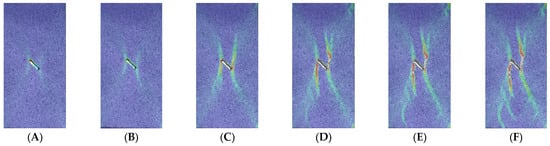 When approaching the peak load at points D, E, and F, significant deformations become apparent. The deformation develops from the tips of the pre-existing crack toward the microcracks that have initiated. The upper tip of the pre-existing crack deforms downward, while the lower tip deforms upward. Only two macroscopic microcracks develop, and there is also a trend for the lower tip of the pre-existing crack to extend downward. Macroscopic cracks initiate multiple directional deformations at different locations and exhibit gradual spreading, branching, and deflection toward the ends [52].