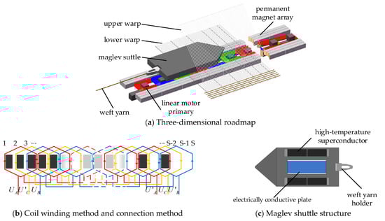 Weaving machines are crucial pieces of mechanical equipment in textile production, and the fabrics they produce find extensive applications in various fields such as clothing, home textiles, aerospace [1], military defense, rail transportation, marine vessels, hydraulic construction, environmental protection, and more [2]. In particular, lightweight and wide carbon fiber fabrics exhibit characteristics such as a high strength, a high modulus, corrosion resistance, fatigue resistance, and seamless construction [3]. When used over large areas, they possess greater overall strength and stability [4]. Currently, the usual approach to enhance the initial velocity of the shuttle, thus increasing the weaving speed and width of the loom, involves improving the mechanical shuttle-throwing structure or employing electromagnetic launching methods. The Swiss company Sulzer improved the shuttle-throwing structure by replacing the fixed cam with a rotating cam, optimizing the cam’s motion curve. This modification reduces the friction between the cam and the shuttle-throwing lever, resulting in a 1.7% increase in the mechanical efficiency of the shuttle-throwing machine [5]. Mirjalilil [6] studied the electromagnetic driving force of the weaving machine’s electromagnetic emission coil. Owlia [7,8,9], from Yazd University, Iran, further utilized the electromagnetic emission coil to accelerate the ferromagnetic pellets that draw the warp threads. Through experimental research on the projectile ejection speed under different parameters of the electromagnetic coil, they established an adaptive neural network model that accurately predicts the projectile speed. Xu [4,10] designed a multi-stage electromagnetic emission structure to increase the initial speed of the warp inserter and concluded that a warp inserter initial speed as high as 126 m/s is required to achieve a 12 m wide fabric. Compared to the mechanical shuttle insertion method, electromagnetic warp insertion provides a faster initial speed for warp insertion, allowing the yarn to travel a greater distance in the shuttle space. However, accelerating the warp inserter to extremely high speeds in a short period results in excessive acceleration for both the inserter itself and the tensioned yarn, leading to severe fluctuations in yarn tension and causing warp thread breakage issues [11,12]. Taking cotton yarn with a strength of 15 cN/tex and a linear density of 200 tex as an exampled, its maximum tensile strength is 30 N, which cannot meet the requirements of high-acceleration wide-width weft insertion. This is particularly problematic in the production of lightweight and wide-width fabrics, as the high acceleration of ultra-fine yarns increases the risk of breakage, limiting the range of wide-width fabrics that can be produced using this method. In summary, whether through improving the shuttle mechanism or changing the warping method, both approaches have limitations in increasing fabric width, and they impose high demands on mechanical structures and yarn strength. Therefore, this paper proposes a high-temperature superconducting magnetic levitation inductive electromagnetic warping scheme. This scheme utilizes the traveling magnetic field generated when the coil winding is energized with an AC to guide the shuttle during the warping process. The levitation force of the shuttle during warping is provided by the high-temperature superconductor. Compared to existing wide-width warping methods, this scheme possesses the following characteristics: