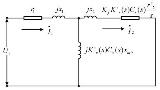 The driving part of the weft insertion system consists of the guideway and the conductive plate, with the permanent magnet array installed on both sides of the guideway. The impact of the permanent magnet array on the weft insertion system’s performance can be neglected. Therefore, when studying the weft insertion system’s performance, it is sufficient to focus on the guideway and the conductive plate and establish an equivalent circuit. The electromagnetic traction coils are wound around the core of the weft insertion guideway in a “half-filled slot” manner, and there is an end effect at both ends of the core. In situations where the thickness of the conductive plate and the air gap are relatively large, the impact of the leakage reactance and skin effect of the conductive plate cannot be ignored. Let and be correction factors for the resistance and magnetizing reactance of the conductive plate due to the longitudinal dynamic end effect, and let and be correction factors for the resistance and magnetizing reactance of the conductive plate due to the transverse end effect, respectively. is the correction factor for the resistance of the conductive plate due to the skin effect. The equivalent circuit of the weft insertion guideway and the conductive plate can be represented as shown in Figure 2.