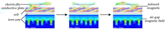 After setting up the simulation parameters, with a simulation duration of 100 ms and a step size of 1 ms, Figure 5 shows the magnetic field contour of the cross-section of the warp insertion guideway and the distribution of the induced magnetic field strength on the conductor plate when the power supply frequency is 50 Hz. From left to right, the subfigures depict the magnetic field characteristics at simulation times of 60 ms, 65 ms, and 70 ms, respectively. In each subfigure, the lower part illustrates the magnetic field generated by the weft insertion guideway, including the magnetic flux distribution, while the upper part displays the distribution of induced magnetic field intensity and direction in the conducting plate. From Figure 5, it can be observed that after applying three-phase voltage, the warp insertion guideway generates a rapidly moving wave magnetic field to the right, inducing an eddy current magnetic field in the conductor plate. Under the interaction of these two magnetic fields, the warp insertion guideway generates a continuous traction force on the shuttle, causing the shuttle to move to the right and achieve warp insertion. By using a variable frequency drive to provide three-phase voltage with the opposite phase sequence, the direction of the traction force can be changed.