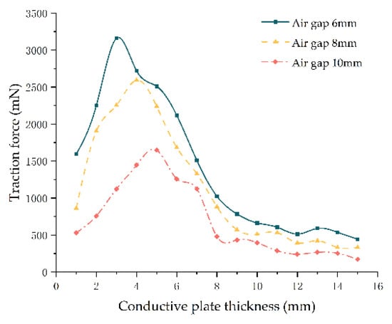 Figure 6 shows the variation curve of the traction force as a function of the thickness of the conductive plate when the slip rate is 1 (shuttle at rest) and the power frequency is 50 Hz. In Figure 6, it can be observed that at gap thicknesses of 6 mm, 8 mm, and 10 mm, the traction force reaches its maximum when the thickness of the conductive plate is 3 mm, 4 mm, and 5 mm, respectively. This is roughly consistent with the relationship between the conductive plate and gap thickness in Equation (12), with an error of 2.67%. To ensure that the shuttle is not affected by the warp during the drawing-in process and to leave a margin in the suspension height, the initial suspension height of the shuttle should be around 10 mm. Therefore, when using the conductive plate as the driving force for the shuttle, in order to obtain greater starting traction force and reduce the starting distance, the optimal thickness of the conductive plate is 5 mm.