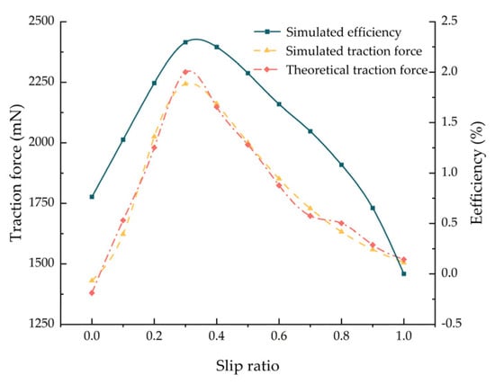Figure 7 shows the curves of the traction force and efficiency of the weft insertion guideway with respect to the slip rate when the air gap thickness is 10 mm, the power frequency is 50 Hz, and the conductive plate thickness is 5 mm. In Figure 7, it can be observed that as the slip rate gradually increases, both the traction force and efficiency show an increasing trend followed by a decrease, reaching their maximum values at a slip rate of 0.3. This is because when the slip rate is less than 0.3, there is a traction force generated in the secondary conductive plate due to the induced eddy current, and it increases with an increase in the slip rate. However, when the slip rate exceeds 0.3, the energy generated by the induced eddy current in the secondary conductive plate is dissipated in the form of heat, leading to a decrease in both the traction force and efficiency.