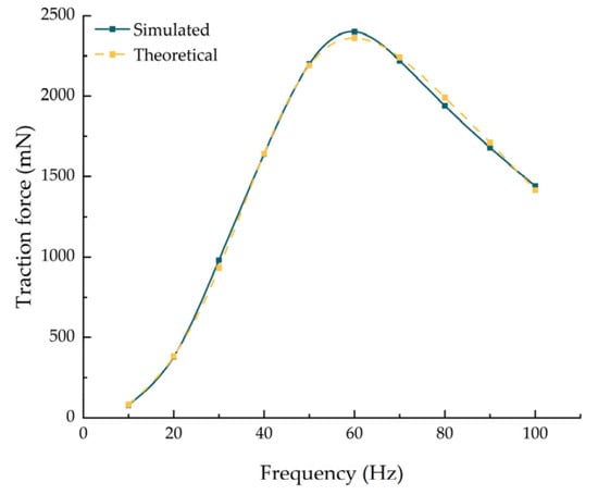 Figure 8 depicts the curve of the traction force of the weft insertion guideway with respect to the power frequency when the gap thickness is 10 mm, the slip rate is 0.3, and the thickness of the conductive plate is 5 mm. In Figure 8, it can be observed that the traction force increases first and then decreases with the power frequency, reaching its maximum at 60 Hz. This is due to the fact that, with the current magnitude unchanged, higher electrical frequencies result in an increased eddy current and hysteresis losses. Therefore, to ensure sufficient traction force for the shuttle during start-up and weaving, and to reduce energy losses, the rated slip ratio of the warp-insertion system should be around 0.3. This implies that the weaving machine should operate at a high speed, and the optimal power frequency is 60 Hz.