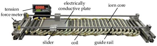 To validate the accuracy of the analytical and simulation calculations, a prototype of the weft insertion guideway was manufactured, and an experimental platform was set up, as shown in Figure 9. The experimental platform consisted of a variable frequency drive, a weft insertion guideway, a shuttle conductive plate, a tension sensor, and a sliding rail. The support force provided by the sliding rail replaced the suspension force of the superconductor, and a tension sensor was used to measure the traction force of the weft insertion guideway. The output voltage of the variable frequency drive used in the experiment is given by Equation (19), with a frequency ranging from 0 to 100 Hz. The structural parameters of the experimental platform are listed in Table 1.