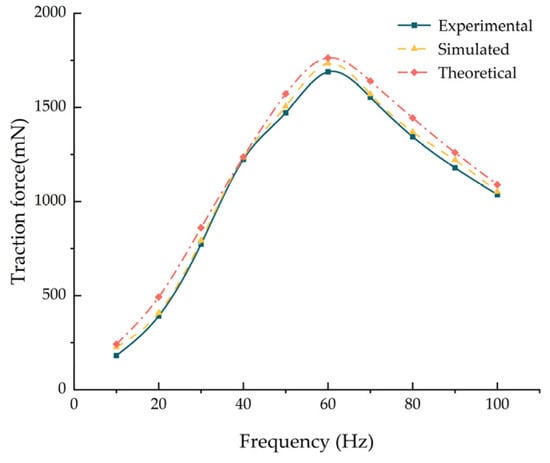 Figure 10 depicts the variation of the traction force exerted by the weft insertion guideway on the conductive plate with the frequency of the power source when the conductive plate thickness is 5 mm, the air gap thickness is 10 mm, and the slip ratio is 1. As seen in Figure 10, the data results for the traction force from the analytical calculations, simulation calculations, and experimental measurements align closely with changes in the power source frequency. This confirms the accuracy of the simulated model for the weft insertion guideway and conductive plate established in this study. These findings hold significant implications for the design of an inductive weft insertion guideway in wide-width looms.