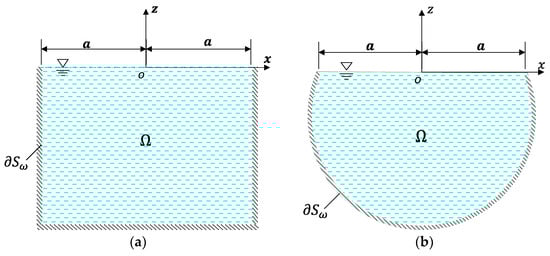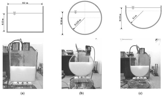 The model adopted is a flat container, through which the 2D liquid sloshing is simulated. The test models and the finite element models are illustrated in Figure 3 and Figure 4, respectively. The four-node acoustic fluid elements are used to model the water domain. The mesh densities of all finite element models were refined until the convergence of the results. Among them, the mesh size of the rectangular container is 0.005 m, and the mesh size of the circular container and U-shaped container along the diameter direction is 0.005 m. The water level and half width of the rectangular container are h = 0.12 m and a = 0.10 m; the water level and radius of the circular container are h = 0.16 m and R = 0.125 m; and the radius, water level, and cavity thickness of the U-shaped container are R = 0.10 m, h = 0.115 m, and 20 mm, respectively [23].