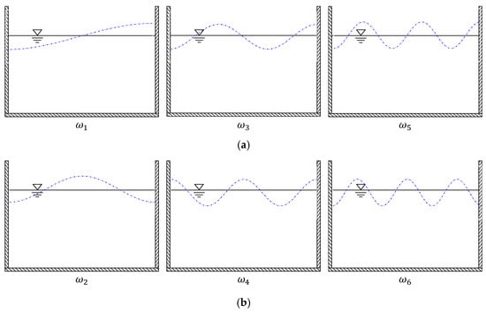 The first six sloshing modes of the free liquid surface in the rectangular container. (a) Antisymmetric (odd-order) modes (). (b) Symmetric (even-order) modes ().