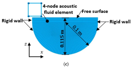 To compare with the 2D models, the models of 3D containers were assigned identical geometrical dimensions to their 2D counterparts. The 3D diagram models and the 3D finite element models are shown in Figure 11 and Figure 12, respectively. Compared to the 2D finite element model, the eight-node acoustic fluid elements are used to model the water domain, and the element size is reduced for enhancing computational efficiency. Among them, the mesh size of the rectangular container is 0.01 m, and the mesh size of the circular container and U-shaped-container along the diameter direction is 0.01 m. For the cuboid container, the water level is h = 0.12 m, and its length and width are a = b = 0.20 m; the water level and radius of the spherical container are h = 0.16 m and R = 0.125 m; the water level and radius at the bottom of the U-shaped 3D container are h = 0.115 m and R = 0.10 m, respectively.
