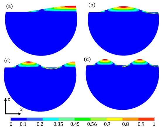 The first four liquid sloshing modes by FEA: (a) 1st; (b) 2nd; (c) 3rd; (d) 4th.
