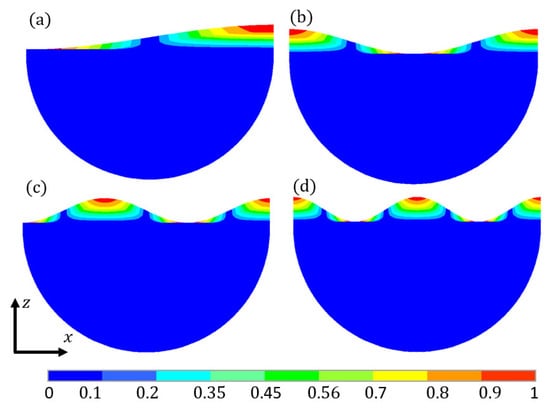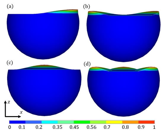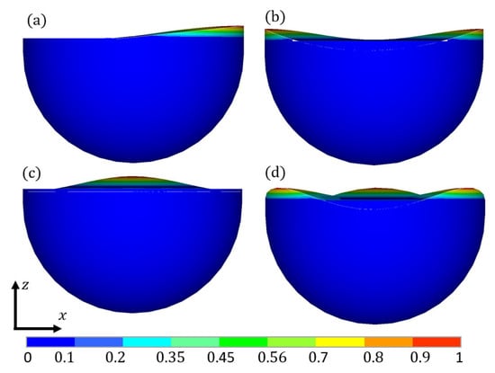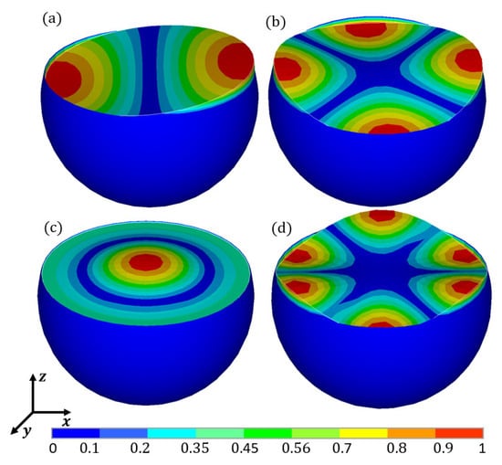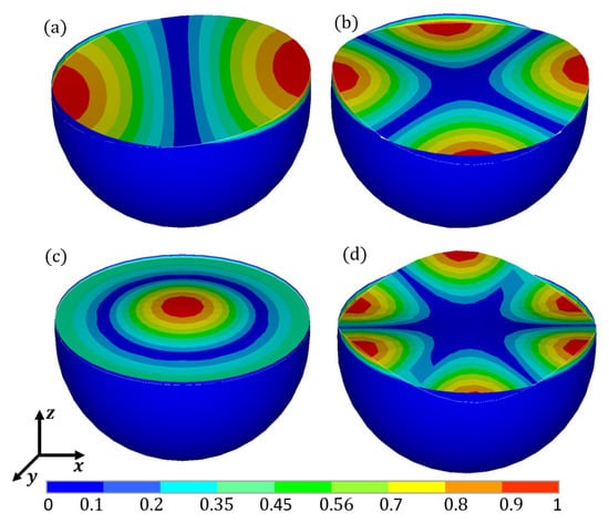 The liquid sloshing modes in the spherical container acquired by FEA are shown in Figure 15 and Figure 16. Comparisons of Figure 7 and Figure 15, combined with Table 1 and Table 2, show that, different from the cuboid and rectangular containers, the liquid sloshing modes in the spherical container do not correspond to those in the spherical container. This is because the length of the free liquid surface in the cuboid container (a = b = 0.20 m) remains identical to that in the rectangular container (a = 0.20 m), while the free liquid surface in the spherical container is not geometrically comparable to that in the spherical container.