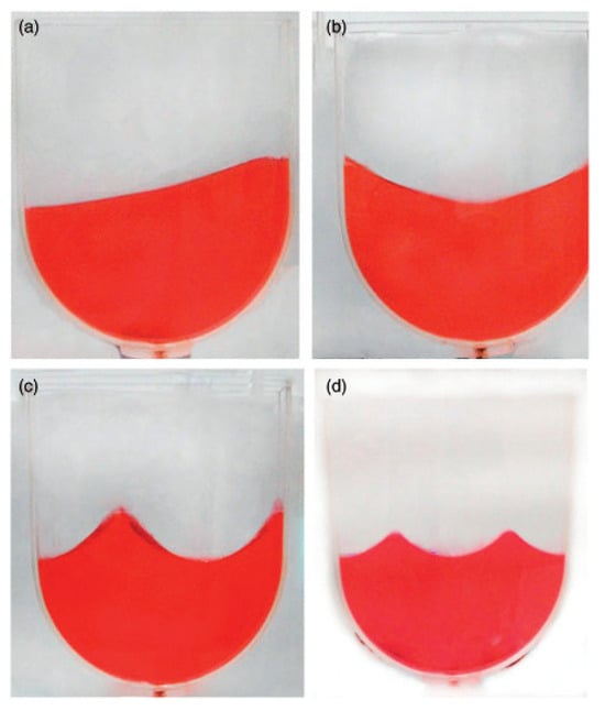 The first four sloshing modes in the U-shaped 2D container attained by FEA are illustrated in Figure 9, while those measured in the tests are shown in Figure 10. Their comparison shows that the sloshing modes attained by FEA are consistent with those measured in the tests, with a subtle difference in only the fourth order, whereas the fourth modes are both symmetric modes, which are regarded as similar (in the theoretical sense). As displayed in Table 1, the sloshing frequencies predicted by FEA match those theoretically calculated for the first four frequencies, with differences of less than 0.5%. The sloshing frequencies obtained by FEA and those measured experimentally differ by no more than 2%, which indicates that the FEA results are reliable (again, the error analysis follows that applied to the rectangular container).