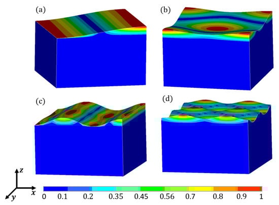 Three-dimensional view of liquid sloshing modes: (a) 1st; (b) 3rd; (c) 6th; (d) 9th.