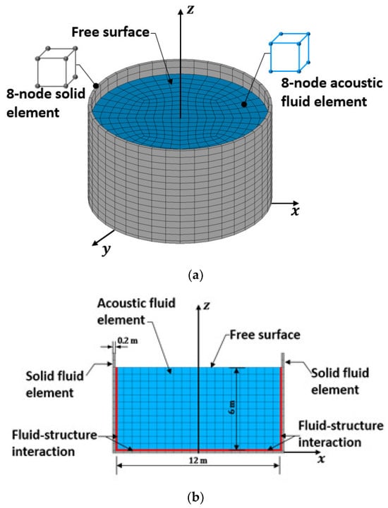 In order to tackle liquid sloshing problems, Dodge et al. [2,3,4,5] systematically expounded the theoretical and engineering applications of liquid sloshing modes. However, these methods pay more attention to theoretical and analytical methods and are only applicable to solving cases with regular shapes and simple external excitations, yet fail to solve vibration problems of liquid-filled structures of complex shapes [6,7]. Bao et al. [8,9] studied liquid modes based on potential-based fluid elements. When using this method, the liquid sloshing frequency is much lower than the structural vibration frequency, and the resulting first hundreds of modes are all liquid sloshing modes rather than modes of solid structures [10]. Therefore, it is difficult to apply the mode-superposition response spectrum method and time history analysis to any dynamic analysis of liquid-filled structures, and these methods are inapplicable to the analysis of dynamic responses of liquid-filled containers.