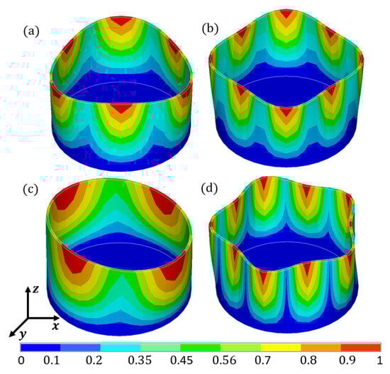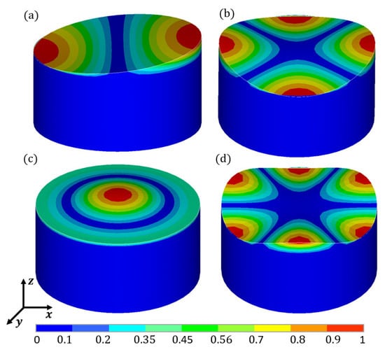 Vibration modes of the cylindrical liquid-filled container: (a) 1st; (b) 2rd; (c) 3rd; (d) 4th.
