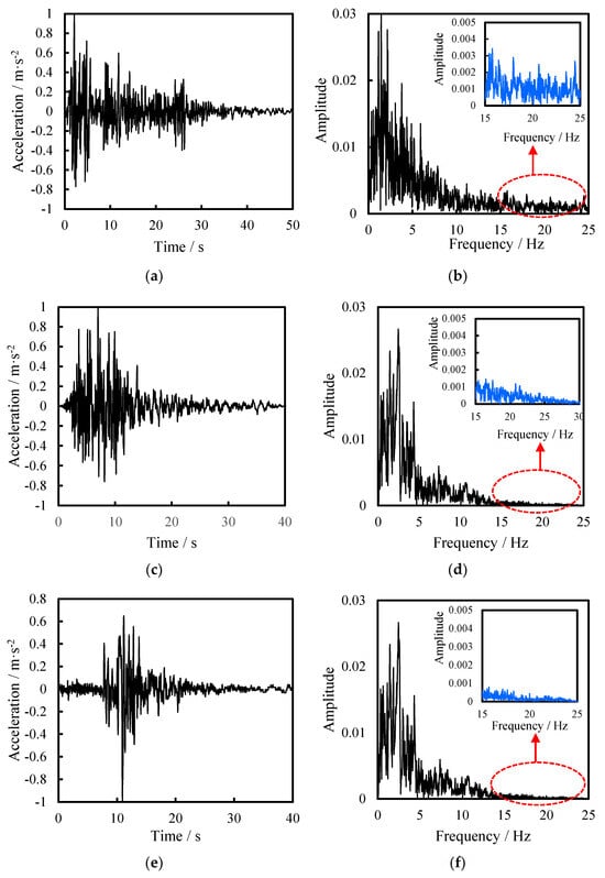 Under the action of different seismic waves, the maximum acceleration on the sidewall of containers with different liquid levels differs greatly in the distribution height. On the one hand, this is because the frequencies of the input seismic waves differ greatly from the structural frequency of vibration. The main frequencies of the El-Centro, Kobe, and Loma Prieta waves are all concentrated within 5 Hz (Figure 24). In the case of different liquid levels, the minimum and maximum first frequencies of the cylindrical container are 13.17 Hz (liquid level of 6 m) and 19.94 Hz (liquid level of 0 m), respectively. This suggests an unobvious acceleration amplification effect. On the other hand, the El-Centro wave has more high-frequency components (above 15 Hz) compared with the Kobe and Loma Prieta waves, so the maximum acceleration on the sidewall under the El-Centro wave is greater than those under the Kobe and Loma Prieta waves.