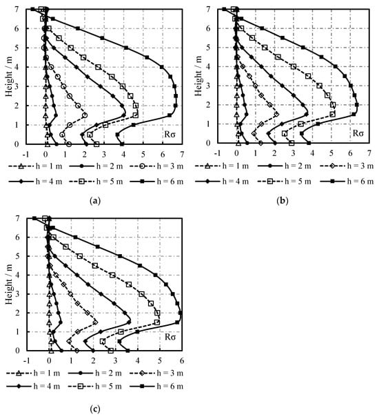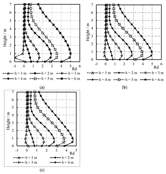 The distribution of the maximum displacement and Rd on the sidewall of containers with different liquid levels along the height are displayed in Figure 25 and Figure 26. As the liquid level rises, the maximum displacement and Rd on the sidewall of cylindrical liquid-filled containers increase. When the liquid levels are 0 (no liquid contained), 1, and 2 m, the maximum displacement on the sidewall appears on the top of the container; under conditions with liquid levels of 3 and 4 m, the maximum displacement on the sidewall appears at the height of 2.5 m; if the liquid levels are 5 and 6 m, the maximum displacement on the sidewall occurs at the height of 3 m. Unlike the distribution of the maximum displacement on the sidewall, the position of the maximum Rd remains largely unchanged.