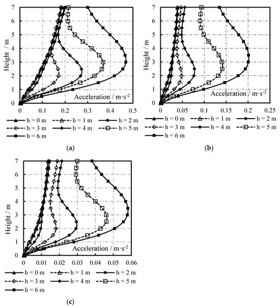 The distribution of the maximum acceleration and Ra on the sidewall of containers with different liquid levels along the height are similar to that of the maximum displacement on the sidewall. Figure 27 and Figure 28 show that as the liquid level rises, the maximum acceleration and Ra on the sidewall of cylindrical liquid-filled containers constantly grow. In the case that the liquid levels are 0, 1, and 2 m, the maximum acceleration on the sidewall appears on the top of the liquid-filled container; if the liquid levels are 3 and 4 m, the maximum acceleration on the sidewall is found at the height of 2.5 m; when the liquid levels are 5 and 6 m, the maximum acceleration on the sidewall occurs at a height of 3 m. The position of the maximum Rd remains almost unchanged.