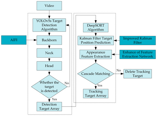 - Target detection: The improved YOLOv5s model is used for target detection in each frame of the image. Focusing on the interference problem of the target in a complex environment with occlusion, the AIFI module with location-coded information is used to replace the space pyramid Pool—Fast (SPPF) module in the backbone network of the original YOLOv5s. Then, all the detection boxes and corresponding coordinates, and confidence and other information, are added to the detection target array;
