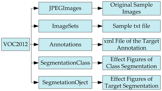 PascalVOC is a commonly used data set in object recognition. VOC2012 is one of the more complete versions, which contains 11,530 images and 20 marked object types, and can complete object classification, object detection, object segmentation, and other tasks. The data storage rule of each file is shown in Figure 2.