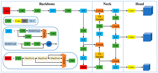 As shown in Figure 5, the network structure of YOLOv5s is divided into four parts: input, backbone network, neck, and head detection. The input includes Mosaic data enhancement, an adaptive anchor frame calculation, and adaptive image scaling; the backbone of YOLOv5s adopts the structure of CSPDarknet53, including multiple convolutional layers, pooling layers, and residual blocks. CSPDarknet53 is a lightweight network structure that can extract high-level features from images, which is one of the features of YOLOv5s; the neck of YOLOv5s adopts the Feature Pyramid Network (FPN) structure, which is used to fuse features with different resolutions to improve the detection accuracy. FPN includes multiple up-sampling and down-sampling operations, as well as feature-fusion operations, which can fuse features of different levels into a unified feature representation. The head of YOLOv5s adopts the YOLOv3 prediction structure, including multiple convolution layers, upper sampling layers, and the final output layer. In the prediction stage, YOLOv5s divides the image into multiple grids and predicts the category and position of the object on each grid, while using the Anchor mechanism to locate the object.