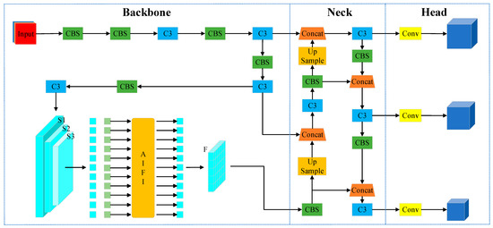 In order to improve the effect of object detection, this paper uses the AIFI module [18] to replace the space pyramid Pool—Fast (SPPF) module on the backbone network of YOLOv5s. The improved YOLOv5s network structure is shown in Figure 6.