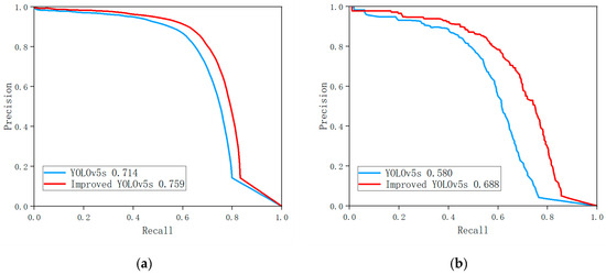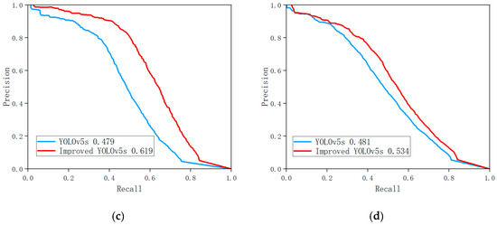 The recall rate and mAP of the original YOLOv5s and the improved YOLOv5s model trained on the VisDrone2019 vehicle detection data set are shown in Figure 10 and Figure 11, respectively. According to the experiment results, we can see that the addition of the AIFI module significantly improved the detection accuracy of the improved YOLOv5s model. Compared to the original YOLOv5s model, the recall rate increased by 7.7%, while the mean average accuracy (mAP) for cars, buses, trucks, and vans improved by 6.3%, 18.6%, 29.2%, and 11%, respectively.