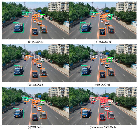 In order to verify the usability of the improved model, this experiment used YOLOv5s, improved YOLOv5s and other versions of the YOLOv5 network model to determine the model’s performance regarding the object detection of vehicles in pictures and videos, and judge the actual detection effect before and after optimization. A total of 750 internet vehicle pictures were randomly selected for the actual performance test. The actual detection speed of each network model is shown in Table 7, and the detection effect is shown in Figure 12; the number above each detection box represents the accuracy of the model when detecting the object, and the closer to 1, the more accurate the detection. As we can see from the experimental results, the improved YOLOv5s can detect more vehicles with higher accuracy and a lower detection delay (the average detection speed of each image is 10.9 ms, second only to YOLOv5n), and the average performance is the best. However, except for YOLOv5n, the width and depth of the network of the other models are greater than that of improved YOLOv5s, which means that the volume of the model generated training is also increasing. This suggests that the model contains more parameters and the accuracy of the entire model is further improved, but the detection speed of the model is sacrificed. The truck detection effect of the improved YOLOv5s presented in this paper is slightly worse than that of larger-model-volume models of YOLOv5m, YOLOv5l, and YOLOv5x, which is not very different from that of the original YOLOv5s model and belongs to the normal error range.