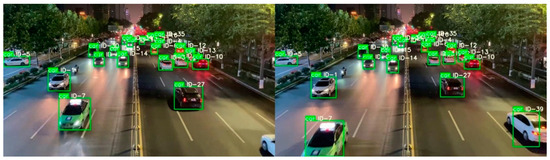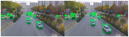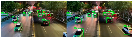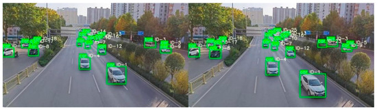 After the input of the collected video material, the results were sent to the multi-target tracking algorithm for target tracking after target detection. In this paper, vehicle images taken during the daytime, night, and rainy days were tracked, and three evaluation indexes, MOTA, MOTP, and Frag, were used to compare the algorithms’ performance. The tracking performance indexes obtained from the experiments are shown in Table 8, and the tracking effects are shown in Figure 13, Figure 14, Figure 15, Figure 16, Figure 17 and Figure 18.