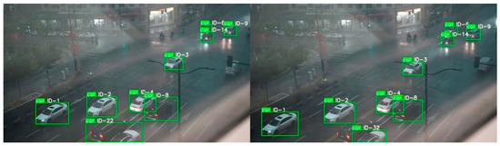 In Figure 17 and Figure 18, due to the influence of rain, different degrees of reflective effect appeared in the environment. In vehicle 22 of frame 27 of the original algorithm, there is a situation where multiple vehicles are present in one frame, and some vehicles could not be detected as they were blocked by traffic lights, so the detection effect is not good. The algorithm presented in this paper does not have a situation where multiple vehicles are present in one frame, and vehicles can be correctly detected and tracked in images with severe occlusion and are less affected by the weather environment. However, the light in the room is reflected to the upper left corner, which seriously interferes with the detection of vehicles, there are obstacles blocking the vehicles in the left corner of Figure 17 and Figure 18, and, in frame 27, only the left rear wheel of the vehicle in the upper right corner was exposed, and its area was small. Hence, neither the original algorithm nor the proposed algorithm could detect these vehicles.