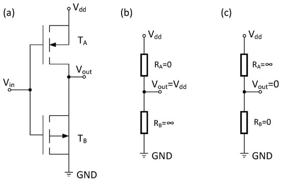 The NOT gate operates in the following manner. If the voltage “0”, then the equivalent electrical circuit is shown in Figure 2b. The transistor TA is open; its resistance . At the same time, the transistor TB is closed, and its resistance RB is close to infinity. It means that the following relation takes place: “1”. If “1”, then TA is closed (its resistance is close to infinity) and TB is open (its resistance is close to zero). It gives (Figure 2c). This situation is common: if one of transistors is open, then the second transistor of the pair is closed.