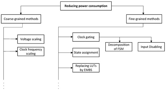 Now, we discuss the most known fine-grained methods of reducing power consumption in the next three Sections of this survey. These methods are the clock-gating, FSM decomposition, state assignment restricting the switching activity, and replacing LUTs by EMBs.