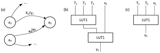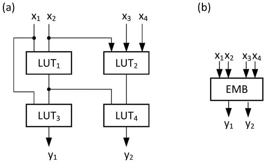 The third group is based on the replacement of LUTs by EMBs. In fact, we are moving from fine-grained LUTs to coarse-grained EMBs. As follows from Figure 5, some group consisting of four LUTs and their interconnections is replaced by a single EMB.