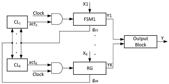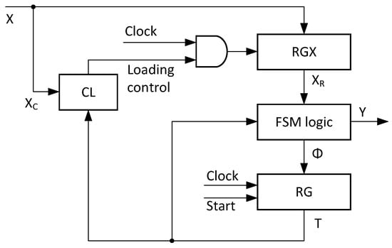 CG assumes using an additional clock logic (CL) block [3]. This logic is based on the precomputation of inputs being disabled [73,74]. In this case, some precomputation logic is added to the CL. It analyzes inputs and state codes to disable the loading of all or a subset of flip-flops of RGX (Figure 8).