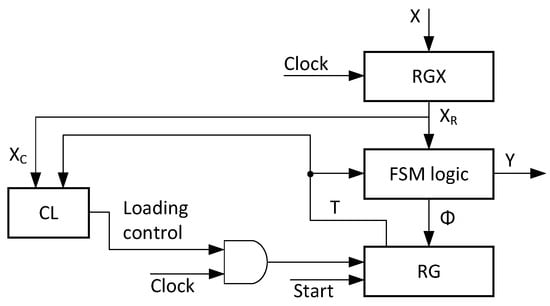A state register (RG) keeps the state codes. The register includes R memory elements (flip-flops) having shared inputs of synchronization (Clock) and reset (Start). Very often, master–slave D flip-flops are used to organize state registers [38,39]. The pulse Clock allows the functions to change the RG content.