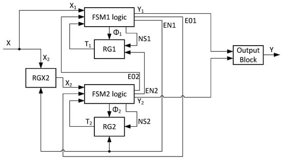 SBF (5) corresponds to function (1), SBF (6) to function (2). Systems (5)–(6) determine a structural diagram of a so-called P Mealy FSM (Figure 1) [39].