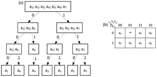 The approach based on (4) defines so-called maximum binary codes [4]. This method is used, for example, in the well-known academic system SIS [36]. But the number of state variables can be different from (4). For example, the one-hot state codes with are used in the academic system ABC [32,37] of Berkeley. The maximum binary codes and one-hot codes define extreme points of the encoding space. There are other approaches for state assignment where the following relation holds: .