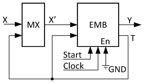 An EMB can be characterized by a pair , where is a number of address inputs, and is a number of memory cell outputs. A single EMB can keep a truth table of an SBF including up to Boolean functions depended on up to arguments [57]. A pair defines a configuration of an EMB with a constant total number of bits (size of EMB):