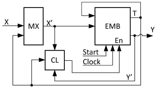 Modern FPGAs include a lot of configurable embedded memory blocks [25]. The EMBs allow the implementation of systems of regular functions [45]. The replacement of LUTs by EMBs allows one to significantly improve the characteristics of resulting FSM circuits [46]. Because of it, there are a lot of design methods targeting EMB-based FSMs [22,46,47,48,49,50,51,52,53,54,55,56]. The survey of different methods of EMB-based design can be found in [45]. Unfortunately, these methods can be used only if there are “free” EMBs, which are not used to implement other parts of a digital system.