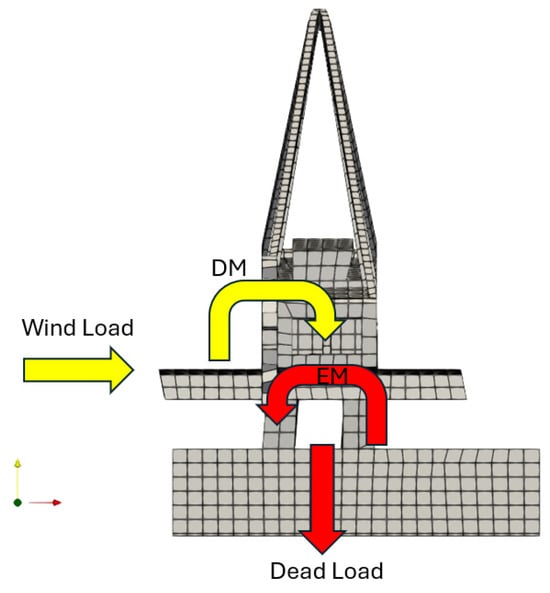 For a wind speed of 68 m/s, considered critical in the analytical model (Figure 16), the ratio of the moments Em/Dm was still lower than 1.5. Similar to previous speeds, the forces predicted by the numerical model were higher than the forces predicted by the analytical model of 1450 kN; the numerical force was about 1900 kN, causing a maximum displacement of 0.17 mm. The stability did not fail in this case.
