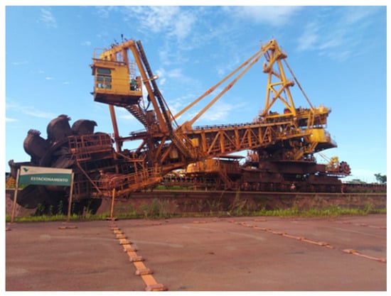 The physical model is an ore reclaimer installed at the port of São Luís in Maranhão, Brazil. It had a width of 34 m and a height of 77 m (Figure 2). Its primary purpose was to extract material from stockpiles and load ships for iron ore exportation for Vale, shown in Figure 2. Due to the high computational effort required to simulate the real structure, a simplified model was used in this paper, represented in Figure 3. The simplified model has the same mass, frontal area, and superior and bottom parts as the real reclaimer. The parts are overlapped with contact steel–steel properties, fixed to the ground, and able to move in the other degrees of freedom.