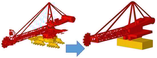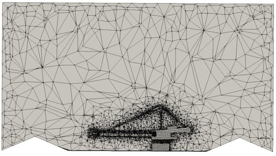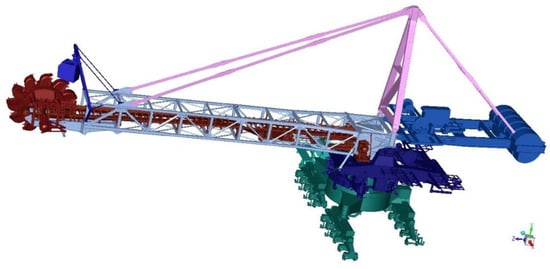 The mesh refinement is shown in Figure 6, with smaller elements next to the reclaimer, growing to the domain limits. The body was set up with all six degrees of freedom and solid–solid contact between the upper reclaimer part (in red in Figure 5) and the lower reclaimer part (in yellow in Figure 5). The lower part was fixed in the ground with all six degrees of freedom fixed.