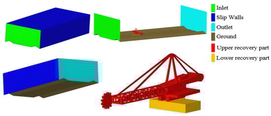 The boundary conditions are represented in Figure 5. To simulate the effect of the wind velocity, the equipment was placed inside an air box, with a prescribed value for the air velocity at the inlet. The prescribed value varied from 36 m/s to 132 m/s. The box dimensions are 115 m in height, 205 m in width, and 500 m in length, according to the requirements presented in [33], which established that it can extend from 10 to 15 times the equipment’s largest dimension. The k-ε turbulence model was used as in reference [4].