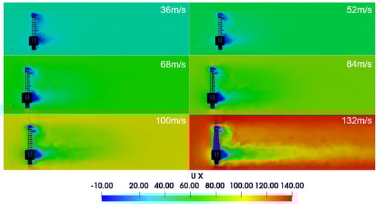 From the first of the six results for the simplified model corresponding to the 36 m/s wind speed, it is clear that there is a difference in the flow separation and wake region when compared to the complex model. This could be attributed to the FSI effects and the model’s capacity to account for structural deformations, which are not considered in the CFD-only approach of the complex model.