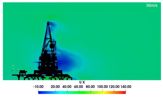 Upon examining the results from both the complex and simplified models of the reclaimer from the superior and lateral views, distinct observations can be made regarding the fluid flow characteristics and structural interactions. For the complex model (Figure 10), which has been analyzed solely under computational fluid dynamics (CFD) at a wind speed of 36 m/s, the visual results indicate detailed flow patterns around the structure. The superior view particularly shows the wake region’s intricate structure and how the wind interacts with the fine geometrical features.