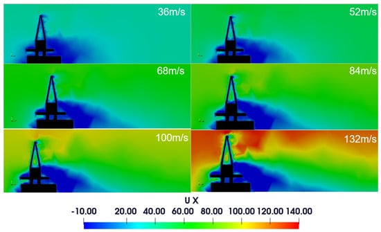 In all simulations, the airflow was considered unsteady due to structural vibration modes. Numerical results showed differences related to the analytical model. It was observed that the wind deflection to the superior part provided a vertical force promoting stability. Although the analytical model indicated a critical velocity of about 68 m/s, the numerical results showed pressure variations and forces stabilizing the equipment for velocities until 132 m/s. These differences may be attributed to the detailed analysis performed in the numerical simulation. The analytical model considers a flat area of 524 square meters, while the numerical solution represents a more realistic geometry, resulting in a different velocity and pressure distribution. Figure 7 presents the velocity fields for wind speeds from 36 m/s to 132 m/s. The vorticity and recirculation zone formed after the equipment increased with the wind velocities, indicating a higher flow perturbation with higher velocities. The reclaimer displacements were more significant with higher wind velocities, causing more disturbance to the fluid. Although the velocity gradients increased with the wind velocity, the recirculation zone did not increase similarly, and the airflow velocities increased to a lesser extent than the free current velocity.